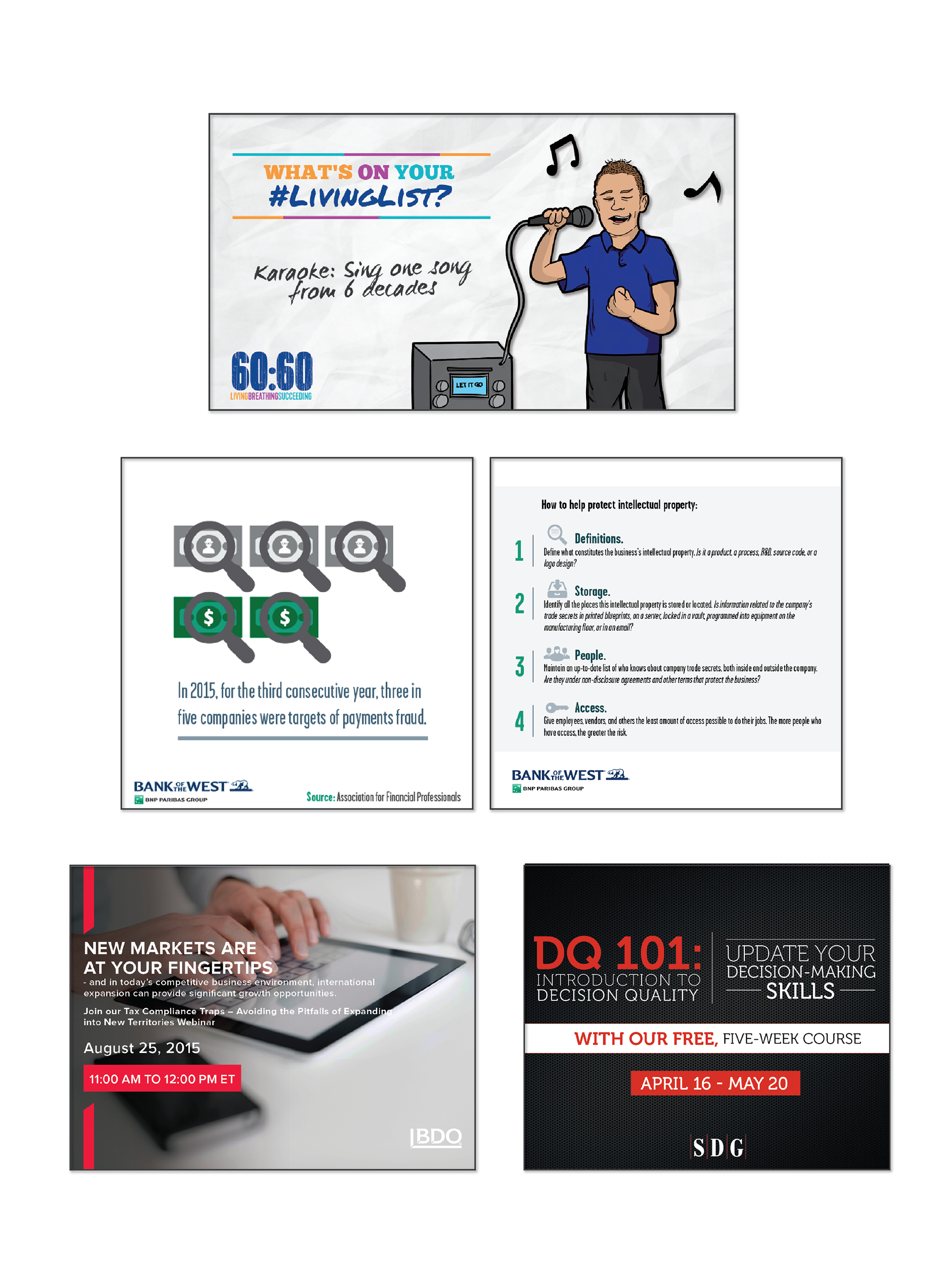 Here are a selection of custom share and cover graphics that I've created for various clients to be used on different social platforms such as Facebook, Twitter and LinkedIn